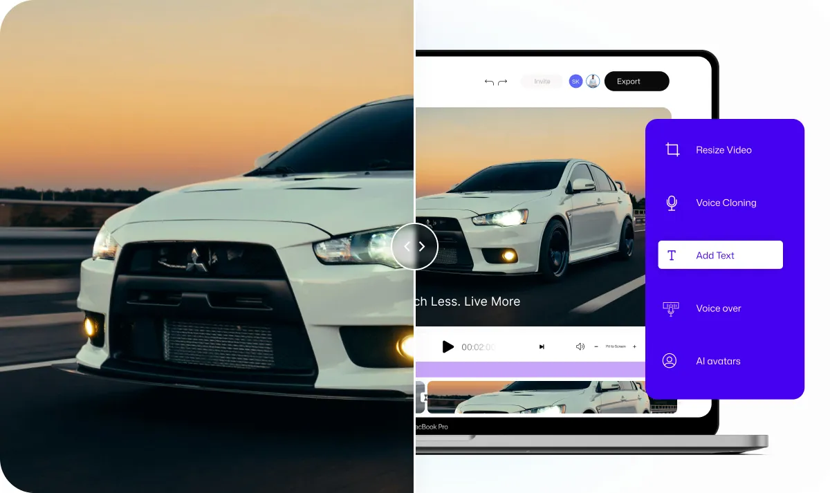 Tambahkan sulih suara yang dihasilkan ke video intro mobil Anda untuk meningkatkan keterlibatan. Pastikan pemahaman dengan narasi profesional dalam berbagai bahasa dan nada.